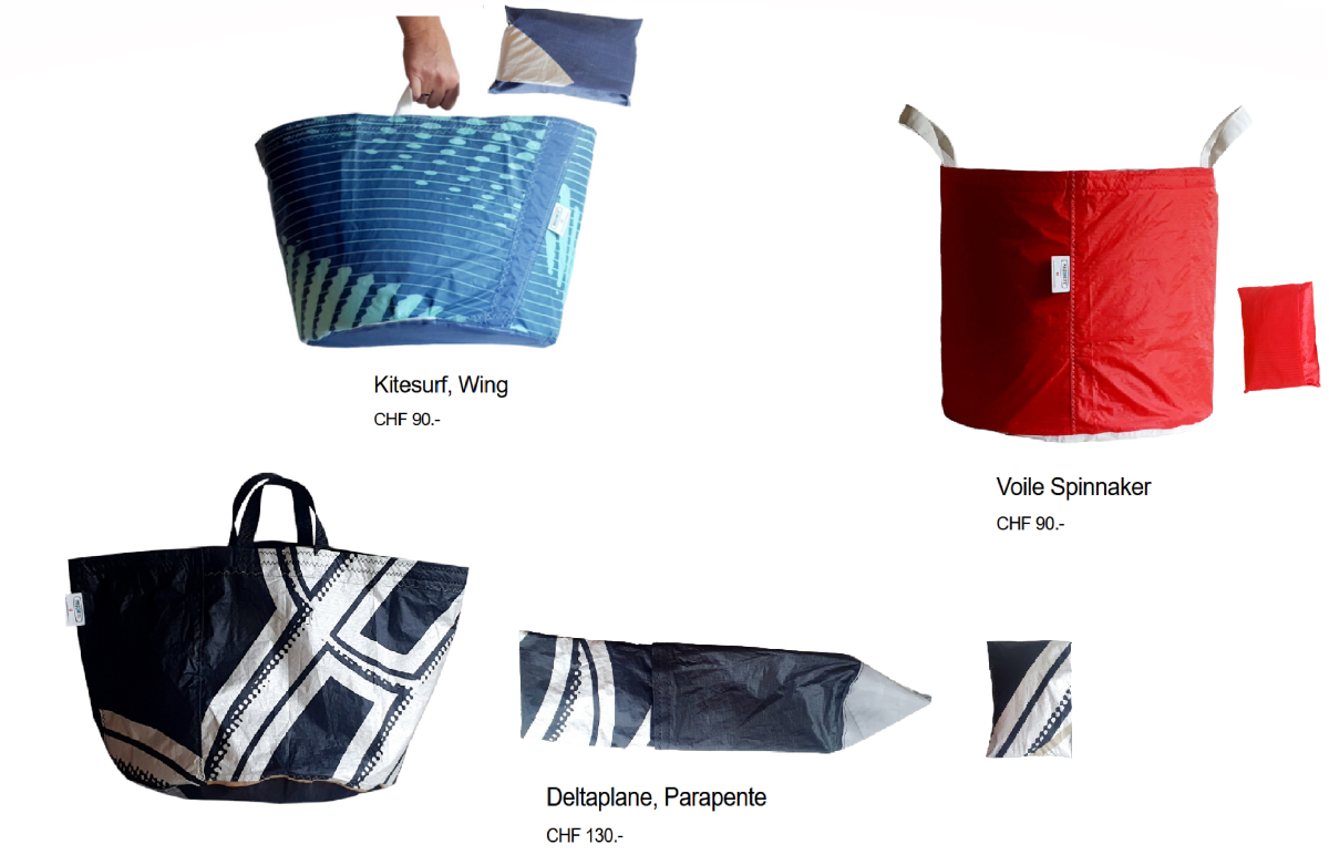 Une voile légère inopérante de kitesurf, wing, parapente, deltaplane ou spinnaker, permet de confectionner de petites séries de sacs unisexes. Chaque exemplaire est numéroté.